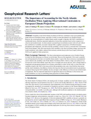 Ballinger, A. P. orcid id iconORCID: https://orcid.org/0000-0003-3704-1976, Schurer, A. P. orcid id iconORCID: https://orcid.org/0000-0002-9176-3622, O'Reilly, C. H. orcid id iconORCID: https://orcid.org/0000-0002-8630-1650 and Hegerl, G. C. orcid id iconORCID: https://orcid.org/0000-0002-4159-1295 (2023) The importance of accounting for the north Atlantic oscillation when applying observational constraints to European climate projections. Geophysical Research Letters, 50 (16). e2023GL103431. ISSN 1944-8007 doi: 10.1029/2023gl103431