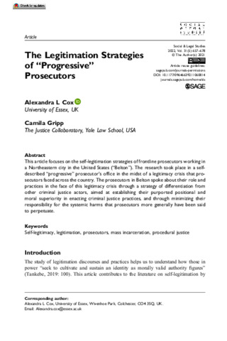 Cox, A. L. orcid id iconORCID: https://orcid.org/0000-0001-9939-078X and Gripp, C. (2022) The legitimation strategies of “Progressive” prosecutors. Social & Legal Studies, 31 (5). pp. 657-678. ISSN 1461-7390 doi: 10.1177/09646639211060814
