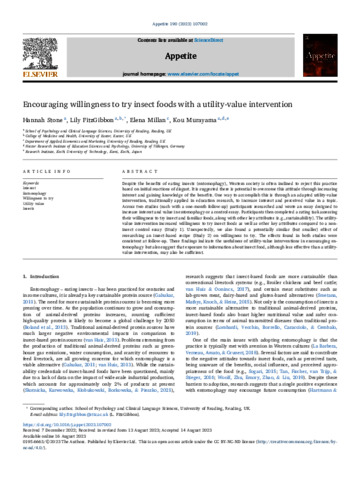 Stone, H., Fitzgibbon, L. orcid id iconORCID: https://orcid.org/0000-0002-8563-391X, Millan, E. orcid id iconORCID: https://orcid.org/0000-0002-2421-2855 and Murayama, K. (2023) Encouraging willingness to try insect foods with a utility-value intervention. Appetite, 190. 107002. ISSN 1095-8304 doi: 10.1016/j.appet.2023.107002