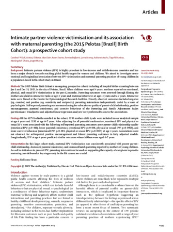 Coll, C. V. N., Barros, A. J. D., Stein, A., Devries, K., Buffarini, R., Murray, L., Arteche, A., Munhoz, T. N., Silveira, M. F. and Murray, J. (2023) Intimate partner violence victimisation and its association with maternal parenting (the 2015 Pelotas [Brazil] Birth Cohort): a prospective cohort study. The Lancet. Global health, 11 (9). e1393-e1401. ISSN 2214-109X doi: 10.1016/S2214-109X(23)00282-6