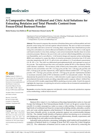 Kumar, R., Methven, L. and Oruna-Concha, M. J. orcid id iconORCID: https://orcid.org/0000-0001-7916-1592 (2023) A comparative study of ethanol and citric acid solutions for extracting betalains and total phenolic content from freeze-dried beetroot powder. Molecules, 28 (17). 6405. ISSN 1420-3049 doi: 10.3390/molecules28176405