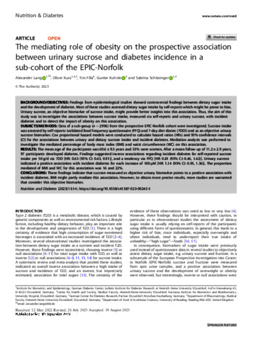 The mediating role of obesity on the prospective association between urinary sucrose and diabetes incidence in a sub-cohort of the EPIC-Norfolk.