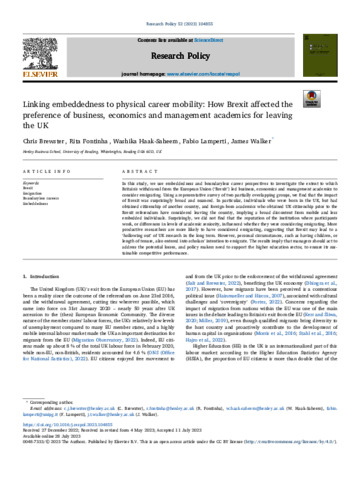 Brewster, C. orcid id iconORCID: https://orcid.org/0000-0001-5314-1518, Fontinha, R. orcid id iconORCID: https://orcid.org/0000-0002-2390-098X, Haak-Saheem, W., Lamperti, F. and Walker, J. orcid id iconORCID: https://orcid.org/0000-0002-3477-0236 (2023) Linking embeddedness to physical career mobility: How Brexit affected the preference of business, economics and management academics for leaving the UK. Research Policy, 52 (9). 104855. ISSN 0048-7333 doi: 10.1016/j.respol.2023.104855