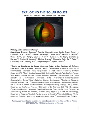 Nandy, D. orcid id iconORCID: https://orcid.org/0000-0001-5205-2302, Banerjee, D. orcid id iconORCID: https://orcid.org/0000-0003-4653-6823, Bhowmik, P. orcid id iconORCID: https://orcid.org/0000-0002-4409-7284, Brun, A. S. orcid id iconORCID: https://orcid.org/0000-0002-1729-8267, Cameron, R. H. orcid id iconORCID: https://orcid.org/0000-0001-9474-8447, Gibson, S. E. orcid id iconORCID: https://orcid.org/0000-0001-9831-2640, Hanasoge, S. orcid id iconORCID: https://orcid.org/0000-0003-2896-1471, Harra, L. orcid id iconORCID: https://orcid.org/0000-0001-9457-6200, Hassler, D. M. orcid id iconORCID: https://orcid.org/0000-0001-8830-1200, Jain, R. orcid id iconORCID: https://orcid.org/0000-0002-0080-5445, Jiang, J. orcid id iconORCID: https://orcid.org/0000-0001-5002-0577, Jouve, L. orcid id iconORCID: https://orcid.org/0000-0003-0657-4737, Mackay, D. H. orcid id iconORCID: https://orcid.org/0000-0001-6065-8531, Mahajan, S. S. orcid id iconORCID: https://orcid.org/0000-0003-1753-8002, Mandrini, C. H. orcid id iconORCID: https://orcid.org/0000-0001-9311-678X, Owens, M. orcid id iconORCID: https://orcid.org/0000-0003-2061-2453, Pal, S. orcid id iconORCID: https://orcid.org/0000-0002-6130-7829, Pinto, R. F. orcid id iconORCID: https://orcid.org/0000-0001-8247-7168, Saha, C. orcid id iconORCID: https://orcid.org/0000-0002-3131-8260, Sun, X. orcid id iconORCID: https://orcid.org/0000-0003-4043-616X, Tripathi, D. orcid id iconORCID: https://orcid.org/0000-0003-1689-6254 and Usoskin, I. G. orcid id iconORCID: https://orcid.org/0000-0001-8227-9081 (2023) Exploring the solar poles: the last great frontier of the sun. Bulletin of the AAS, 55 (3). ISSN 0002-7537 doi: 10.3847/25c2cfeb.1160b0ef