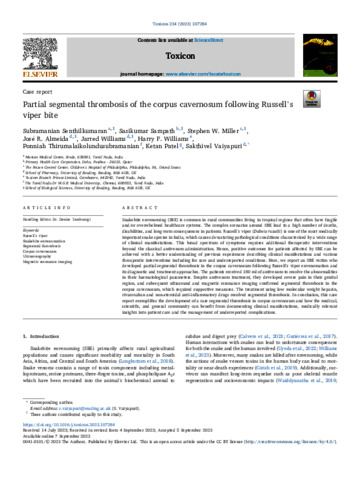 Snakebite envenoming (SBE) is common in rural communities living in tropical regions that often have fragile and/or overwhelmed healthcare systems. The complex scenarios around SBE lead to a high number of deaths, disabilities, and long-term consequences in patients. Russell’s viper (Daboia russelii) is one of the most medically important snake species in India, which causes devastating pathological conditions characterised by a wide range of clinical manifestations. This broad spectrum of symptoms requires additional therapeutic interventions beyond the classical antivenom administration. Hence, positive outcomes for patients affected by SBE can be achieved with a better understanding of previous experiences describing clinical manifestations and various therapeutic interventions including for rare and underreported conditions. Here, we report an SBE victim who developed partial segmental thrombosis in the corpus cavernosum following Russell’s viper envenomation and its diagnostic and treatment approaches. The patients received 180 ml of antivenom to resolve the abnormalities in their haematological parameters. Despite antivenom treatment, they developed severe pain in their genital region, and subsequent ultrasound and magnetic resonance imaging confirmed segmental thrombosis in the corpus cavernosum, which required supportive measures. The treatment using low molecular weight heparin, rivaroxaban and non-steroidal anti-inflammatory drugs resolved segmental thrombosis. In conclusion, this case report exemplifies the development of a rare segmental thrombosis in corpus cavernosum and how the medical, scientific, and general community can benefit from documenting clinical manifestations, medically relevant insights into patient care and the management of underreported complications.