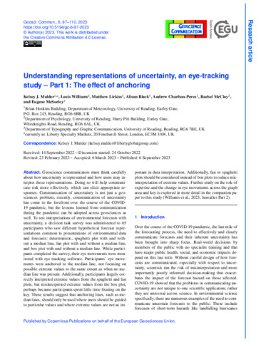 Geoscience communicators must think carefully about how uncertainty is represented and how users may interpret these representations. Doing so will help communicate risk more effectively, which can elicit appropriate responses. Communication of uncertainty is not just a geosciences problem; recently, communication of uncertainty has come to the forefront over the course of the COVID19 pandemic, but the lessons learned from communication during the pandemic can be adopted across geosciences as well. To test interpretations of environmental forecasts with uncertainty, a decision task survey was administered to 65 participants who saw different hypothetical forecast representations common to presentations of environmental data and forecasts: deterministic, spaghetti plot with and without a median line, fan plot with and without a median line, and box plot with and without a median line. While participants completed the survey, their eye movements were monitored with eye-tracking software. Participants’ eye movements were anchored to the median line, not focusing on possible extreme values to the same extent as when no median line was present. Additionally, participants largely correctly interpreted extreme values from the spaghetti and fan plots, but misinterpreted extreme values from the box plot, perhaps because participants spent little time fixating on the key. These results suggest that anchoring lines, such as median lines, should only be used where users should be guided to particular values and where extreme values are not as important in data interpretation. Additionally, fan or spaghetti plots should be considered instead of box plots to reduce misinterpretation of extreme values. Further study on the role of expertise and the change in eye movements across the graph area and key is explored in more detail in the companion paper to this study (Williams et al., 2023; hereafter Part 2).
