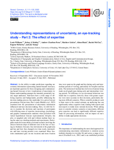 Williams, L., Mulder, K. J., Charlton-Perez, A. orcid id iconORCID: https://orcid.org/0000-0001-8179-6220, Lickiss, M., Black, A., McCloy, R. orcid id iconORCID: https://orcid.org/0000-0003-2333-9640, McSorley, E. orcid id iconORCID: https://orcid.org/0000-0002-2054-879X and Young, J. (2023) Understanding representations of uncertainty, an eye-tracking study – part 2: the effect of expertise. Geoscience Communications, 6 (3). pp. 111-123. ISSN 2569-7110 doi: 10.5194/gc-6-111-2023