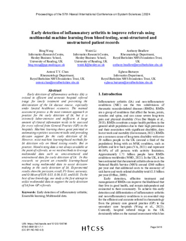 Wang, B. orcid id iconORCID: https://orcid.org/0000-0003-1403-1847, Li, W. orcid id iconORCID: https://orcid.org/0000-0003-2878-3185, Bradlow, A., Chan, A. T. Y. and Bazuaye, E. (2024) Early detection of inflammatory arthritis to improve referrals using multimodal machine learning from blood testing, semi-structured and unstructured patient records. In: The 57th Hawaii International Conference on System Sciences, 3-6 Jan 2024, Hawaii, pp. 3416-3424.