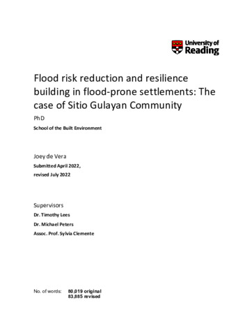 De Vera, J. (2022) Flood risk reduction and resilience building in flood-prone settlements: the case of Sitio Gulayan community. PhD thesis, University of Reading. doi: 10.48683/1926.00113230