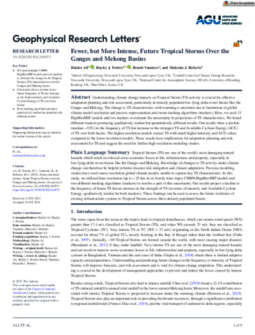 Ali, H. orcid id iconORCID: https://orcid.org/0000-0002-9846-6751, Fowler, H. J. orcid id iconORCID: https://orcid.org/0000-0001-8848-3606, Vanniere, B. orcid id iconORCID: https://orcid.org/0000-0001-8600-400X and Roberts, M. J. (2023) Fewer, but more intense, future tropical storms over the Ganges and Mekong basins. Geophysical Research Letters, 50 (17). e2023GL104973. ISSN 1944-8007 doi: 10.1029/2023gl104973