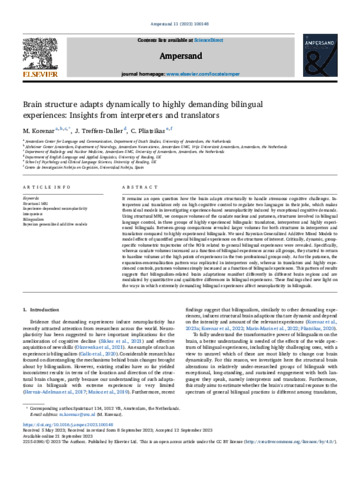 Korenar, M., Treffers-Daller, J. orcid id iconORCID: https://orcid.org/0000-0002-6575-6736 and Pliatsikas, C. orcid id iconORCID: https://orcid.org/0000-0001-7093-1773 (2023) Brain structure adapts dynamically to highly demanding bilingual experiences: insights from interpreters and translators. Ampersand, 11. 100148. ISSN 2215-0390 doi: 10.1016/j.amper.2023.100148
