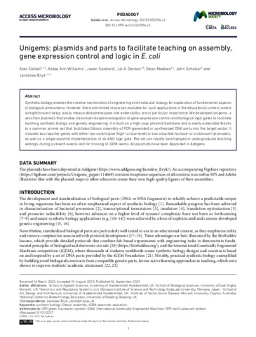 Siddall, A., Williams, A. A., Sanders, J., Denton, J. A., Madden, D., Schollar, J. and Bryk, J. orcid id iconORCID: https://orcid.org/0000-0002-2791-9709 (2023) Unigems: plasmids and parts to facilitate teaching on assembly, gene expression control and logic in E. coli. Access Microbiology, 5 (9). ISSN 2516-8290 doi: 10.1099/acmi.0.000596.v3
