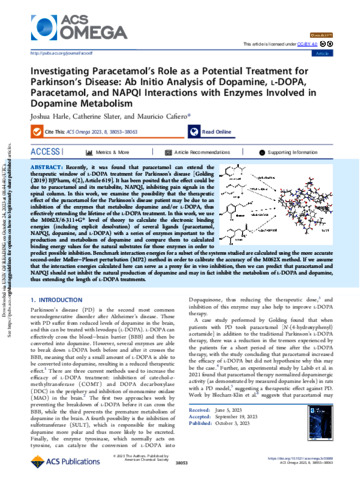 Harle, J., Slater, C. and Cafiero, M. orcid id iconORCID: https://orcid.org/0000-0002-4895-1783 (2023) Investigating paracetamol's role as a potential treatment for Parkinson's Disease: ab initio analysis of dopamine, L-DOPA, paracetamol, and NAPQI interactions with enzymes involved in dopamine metabolism. ACS Omega, 8 (41). pp. 38053-38063. ISSN 2470-1343 doi: 10.1021/acsomega.3c03888