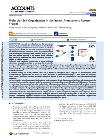 Aerosols are ubiquitous in the atmosphere. Outdoors, they take part in the climate system via cloud droplet formation, and they contribute to indoor and outdoor air pollution, impacting human health and man-made environmental change. In the indoor environment, aerosols are formed by common activities such as cooking and cleaning. People can spend up to ca. 90% of their time indoors, especially in the western world. Therefore, there is a need to understand how indoor aerosols are processed in addition to outdoor aerosols. Surfactants make significant contributions to aerosol emissions, with sources ranging from cooking to sea spray. These molecules alter the cloud droplet formation potential by changing the surface tension of aqueous droplets and thus increasing their ability to grow. They can also coat solid surfaces such as windows (“window grime”) and dust particles. Such surface films are more important indoors due to the higher surface-to-volume ratio compared to the outdoor environment, increasing the likelihood of surface film–pollutant interactions. A common cooking and marine emission, oleic acid, is known to self-organize into a range of 3-D nanostructures. These nanostructures are highly viscous and as such can impact the kinetics of aerosol and film aging (i.e., water uptake and oxidation). There is still a discrepancy between the longer atmospheric lifetime of oleic acid compared with laboratory experiment-based predictions. We have created a body of experimental and modeling work focusing on the novel proposition of surfactant self-organization in the atmosphere. Self-organized proxies were studied as nanometer-to-micrometer films, levitated droplets, and bulk mixtures. This access to a wide range of geometries and scales has resulted in the following main conclusions: (i) an atmospherically abundant surfactant can self-organize into a range of viscous nanostructures in the presence of other compounds commonly encountered in atmospheric aerosols; (ii) surfactant self-organization significantly reduces the reactivity of the organic phase, increasing the chemical lifetime of these surfactant molecules and other particle constituents; (iii) while self-assembly was found over a wide range of conditions and compositions, the specific, observed nanostructure is highly sensitive to mixture composition; and (iv) a “crust” of product material forms on the surface of reacting particles and films, limiting the diffusion of reactive gases to the particle or film bulk and subsequent reactivity. These findings suggest that hazardous, reactive materials may be protected in aerosol matrixes underneath a highly viscous shell, thus extending the atmospheric residence times of otherwise short-lived species.