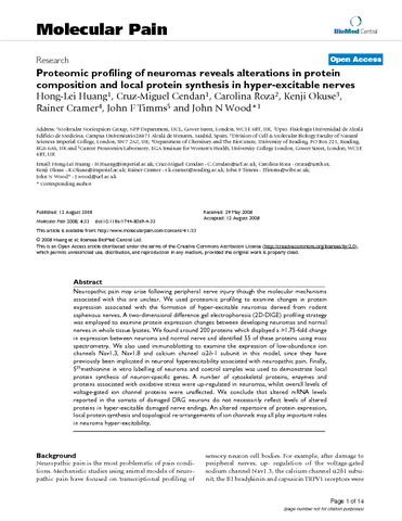 Huang, H.L., Cendan, C.M., Roza, C., Okuse, K., Cramer, R. orcid id iconORCID: https://orcid.org/0000-0002-8037-2511, Timms, J.F. and Wood, J.N. (2008) Proteomic profiling of neuromas reveals alterations in protein composition and local protein synthesis in hyper-excitable nerves. Molecular Pain, 4. p. 33. ISSN 1744-8069 doi: 10.1186/1744-8069-4-33