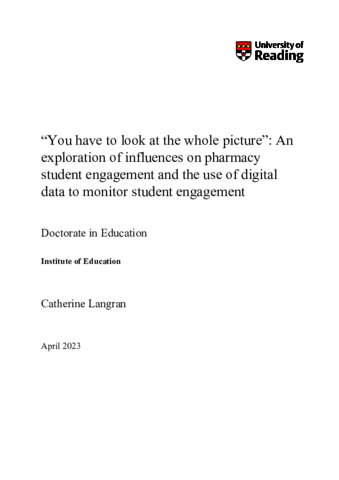 Within UK universities, student retention and preventing drop out is of key importance. Students dropping out of university has major financial and reputational implications for universities. For students, dropping out can be associated with negative mental, social and financial consequences. Tinto’s model of student dropout outlines the longitudinal student journey throughout their time at university and the social and academic factors that may influence whether a student persists or leaves university. High student engagement has been shown to be strongly correlated with student attainment and retention. Within the Master of Pharmacy (MPharm) degree, students are expected to have high levels of engagement as part of their professional responsibility to learn the necessary knowledge, skills and competence to be a pharmacist. Student engagement may be seen through attendance at teaching activities, accessing teaching materials on the virtual learning environment (VLE) and use of the university library. Learning analytics is a system of collecting and reporting engagement data to give a picture of student engagement. This may be used to identify students in difficulty and intervene to help support their re-engagement. This thesis aimed to explore the influences on MPharm student engagement, and which aspects were most important for students. This thesis also explored students’ perceptions of engagement monitoring systems and the potential impact these may have on changing their engagement behaviour. Semi-structured interviews were undertaken with thirteen MPharm students at the start (October 2020) and end (March 2021) of an academic teaching year. Students were presented with their VLE engagement data every two to three weeks throughout the two academic teaching terms. Interview transcripts were analysed deductively according to Tinto’s model of student dropout and the COM-B behavioural change model. Participants described a multitude of factors that influenced their engagement. This included: a supportive family and social network, their pre-university educational experience, individual attributes, interactions with staff, and teaching approaches. Participants’ goal related motivation to become a pharmacist was shown to be the most impactful on their commitment and engagement at university. Most participants enjoyed receiving their VLE engagement data and used this data to benchmark their engagement compared to the cohort average. Some participants described reflecting on the VLE engagement data and being motivated to change their engagement behaviours to be the same or better than the cohort average. Knowing how to change, confidence, time and workload were described as the main barriers preventing some participants changing their behaviour to be more engaged. All participants were accepting of their engagement data being collected by university, as long as consent was given, assurances of data protection were given, and the data was used by staff in a supportive not punitive way. These findings have added to the literature on student engagement and will be used within the department and university to make improvements to engagement monitoring processes and supporting students. Recommendations include the introduction of peer-led student engagement support sessions, increased frequency of tutor meetings, and the introduction of an automated student facing engagement monitoring system.
