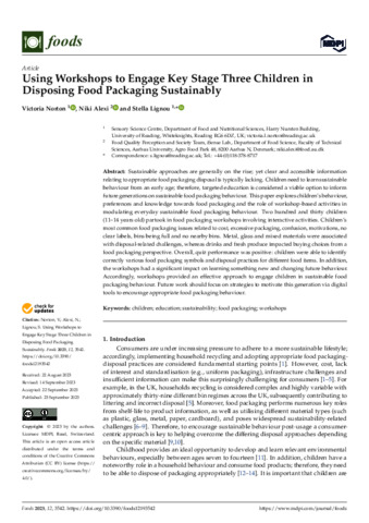 Sustainable approaches are generally on the rise; yet clear and accessible information relating to appropriate food packaging disposal is typically lacking. Children need to learn sustainable behaviour from an early age; therefore, targeted education is considered a viable option to inform future generations on sustainable food packaging behaviour. This paper explores children’s behaviour, preferences and knowledge towards food packaging and the role of workshop-based activities in modulating everyday sustainable food packaging behaviour. Two hundred and thirty children (11–14 years old) partook in food packaging workshops involving interactive activities. Children’s most common food packaging issues related to cost, excessive packaging, confusion, motivations, no clear labels, bins being full and no nearby bins. Metal, glass and mixed materials were associated with disposal-related challenges, whereas drinks and fresh produce impacted buying choices from a food packaging perspective. Overall, quiz performance was positive: children were able to identify correctly various food packaging symbols and disposal practices for different food items. In addition, the workshops had a significant impact on learning something new and changing future behaviour. Accordingly, workshops provided an effective approach to engage children in sustainable food packaging behaviour. Future work should focus on strategies to motivate this generation via digital tools to encourage appropriate food packaging behaviour.