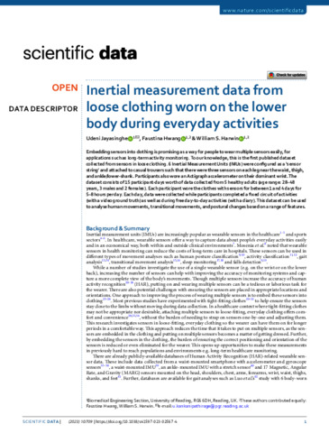 Embedding sensors into clothing is promising as a way for people to wear multiple sensors easily, for applications such as long-term activity monitoring. To our knowledge, this is the first published dataset collected from sensors in loose clothing. 6 Inertial Measurement Units (IMUs) were configured as a ‘sensor string’ and attached to casual trousers such that there were three sensors on each leg near the waist, thigh, and ankle/lower-shank. Participants also wore an Actigraph accelerometer on their dominant wrist. The dataset consists of 15 participant-days worth of data collected from 5 healthy adults (age range: 28 - 48 years, 3 males and 2 females). Each participant wore the clothes with sensors for between 1 and 4 days for 5-8 hours per day. Each day, data were collected while participants completed a fixed circuit of activities (with a video ground truth) as well as during free day-to-day activities (with a diary). This dataset can be used to analyse human movements, transitional movements, and postural changes based on a range of features.