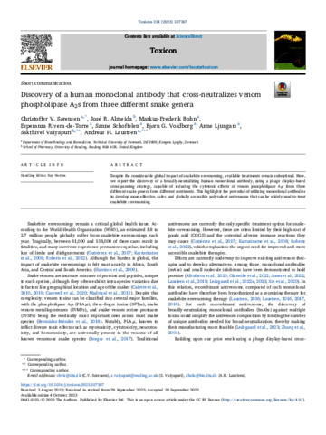 Sørensen, C. V., Almeida, J. R. orcid id iconORCID: https://orcid.org/0000-0002-4637-4468, Bohn, M.-F., Torre, E. R. d., Schoffelen, S., Voldborg, B. G., Ljungars, A., Vaiyapuri, S. orcid id iconORCID: https://orcid.org/0000-0002-6006-6517 and Laustsen, A. H. (2023) Discovery of a human monoclonal antibody that cross-neutralizes venom phospholipase A2s from three different snake genera. Toxicon, 234. 107307. ISSN 0041-0101 doi: 10.1016/j.toxicon.2023.107307