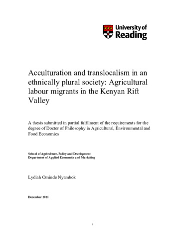 Nyambok, L. O. (2022) Acculturation and translocalism in an ethnically plural society: agricultural labour migrants in the Kenyan Rift Valley. PhD thesis, University of Reading. doi: 10.48683/1926.00113530