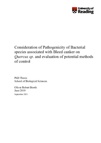 Booth, O. R. (2021) Consideration of Pathogenicity of Bacterial species associated with Bleed canker on Quercus sp. and evaluation of potential methods of control. PhD thesis, University of Reading. doi: 10.48683/1926.00113533