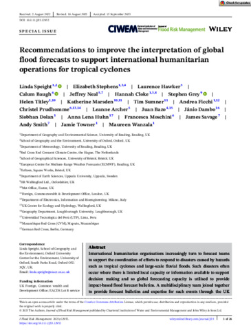 Recommendations to improve the interpretation of global flood forecasts to support international humanitarian operations for tropical cyclones.