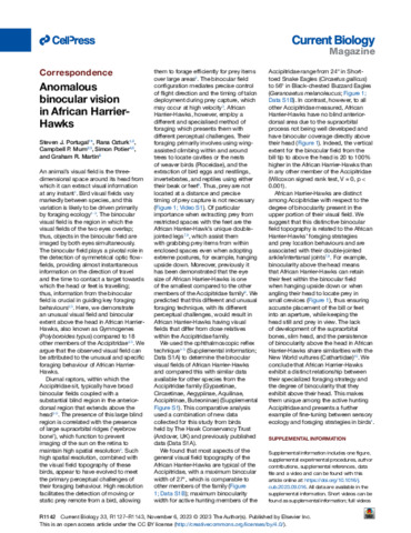 An animal’s visual field is the three-dimensional space around its head from which it can extract visual information at any instant. Bird visual fields vary markedly between species, and this variation is likely to be driven primarily by foraging ecology. We used the ophthalmoscopic reflex technique to determine the binocular visual fields of African Harrier-hawks and compared this with similar data available for other species from the Accipitridae family (Gypaetinae, Circaetinae, Aegypiinae, Aquilinae, Accipitrinae, Buteoninae). African Harrier-hawks are distinct among Accipitridae with respect to the degree of binocularity present in the upper portion of their visual field. We suggest that this distinctive binocular field topography is related to the African Harrier-hawks’ foraging strategies and prey location behaviours and are associated with their double-jointed ankle/intertarsal joints.