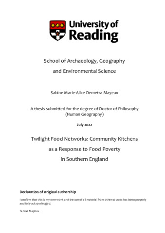 Mayeux, S. (2023) Twilight food networks: community kitchens as a response to food poverty in Southern England. PhD thesis, University of Reading. doi: 10.48683/1926.00113545