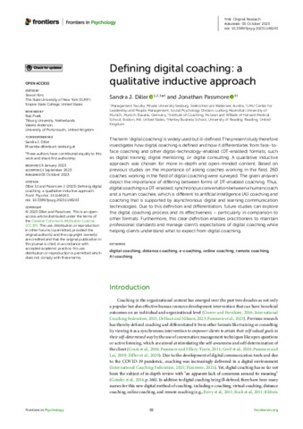The term ‘digital coaching’ is widely used but ill-defined. The present study therefore investigates how digital coaching is defined and how it differentiates from face-to-face coaching and other digital-technology-enabled (DT-enabled) formats, such as digital training, digital mentoring, or digital consulting. A qualitative inductive approach was chosen for more in-depth and open-minded content. Based on previous studies on the importance of asking coaches working in the field, 260 coaches working in the field of digital coaching were surveyed. The given answers depict the importance of differing between forms of DT-enabled coaching. Thus, digital coaching is a DT-enabled, synchronous conversation between a human coach and a human coachee, which is different to artificial intelligence (AI) coaching and coaching that is supported by asynchronous digital and learning communication technologies. Due to this definition and differentiation, future studies can explore the digital coaching process and its effectiveness – particularly in comparison to other formats. Furthermore, this clear definition enables practitioners to maintain professional standards and manage client’s expectations of digital coaching while helping clients understand what to expect from digital coaching.