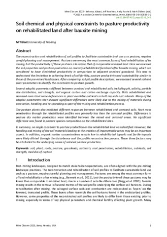 The reconstruction and rehabilitation of soil profiles to facilitate sustainable land use as a pasture, requires careful planning and management. Pastures are among the most common form of land rehabilitation after mining, but the productivity of these pastures is less than that of comparable unmined land. Here we assessed the soil properties and pasture production on recently rehabilitated farmland after bauxite mining, which are considered to have diminished productivity in comparison to adjacent unmined grassland. This was to understand the limitation to achieving levels of soil fertility, pasture productivity and sustainability similar to those of the pre-mined landscapes. After comparing soil pit profile descriptions, we assessed several soil and plant parameters to identify the constraints to pasture growth. Several edaphic parameters differed between unmined and rehabilitated soils, including pH, salinity, particle size distribution, soil strength, soil organic carbon and cation exchange capacity. Both rehabilitated and unmined areas had some deficiencies in plant available nutrients in both topsoils and subsoils. Many of the edaphic parameters that showed significant differences were likely due to the mixing of materials during excavation, handling and re-spreading as part of the mining and rehabilitation process. The pasture plants also exhibited different responses between rehabilitated and unmined soils. Root mass penetration through the rehabilitated profiles was generally less than the unmined profiles. Differences in pasture dry matter production were identified between the mined and unmined areas. No significant difference was found in pasture species composition on the rehabilitated sites. In summary, no single constraint to pasture production on the rehabilitated land was identified. However, the handling and mixing of the soil materials leading to the creation of impenetrable zones may be an important aspect. In addition, organic matter concentrations remain low in rehabilitated topsoils and fertile topsoils were likely diluted through the disturbance and the profile reconstruction process. These three factors may be attributed to the underlying cause of reduced pasture production.