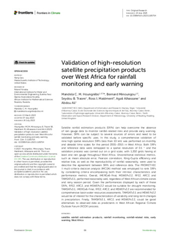 Houngnibo, M. C. M., Minoungou, B., Traore, S. B., Maidment, R. I. orcid id iconORCID: https://orcid.org/0000-0003-2054-3259, Alhassane, A. and Ali, A. (2023) Validation of high-resolution satellite precipitation products over West Africa for rainfall monitoring and early warning. Frontiers in climate, 5. 1185754. ISSN 2624-9553 doi: 10.3389/fclim.2023.1185754