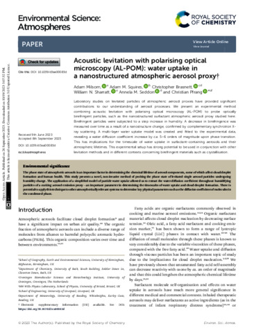 Acoustic levitation with polarising optical microscopy (AL-POM): water uptake in a nanostructured atmospheric aerosol proxy.