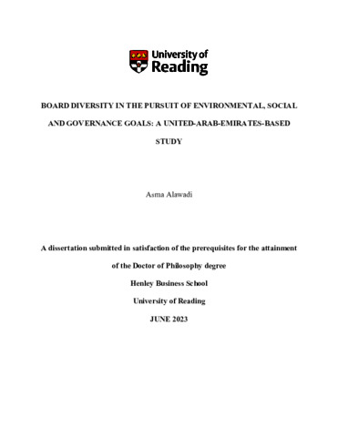 Alawadi, A. (2023) Board diversity in the pursuit of environmental, social and governance goals: a United-Arab-Emirates-based study. PhD thesis, University of Reading. doi: 10.48683/1926.00113656