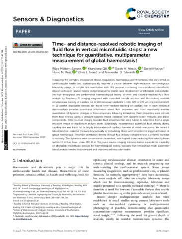 Sariyer, R. M., Gill, K., Needs, S. H. orcid id iconORCID: https://orcid.org/0000-0003-3407-9637, Hodge, D., Reis, N. M., Jones, C. I. orcid id iconORCID: https://orcid.org/0000-0001-7537-1509 and Edwards, A. D. orcid id iconORCID: https://orcid.org/0000-0003-2369-989X (2023) Time- and distance-resolved robotic imaging of fluid flow in vertical microfluidic strips: a new technique for quantitative, multiparameter measurement of global haemostasis. Sensors and Diagnostics, 2 (6). pp. 1623-1637. ISSN 2635-0998 doi: 10.1039/D3SD00162H