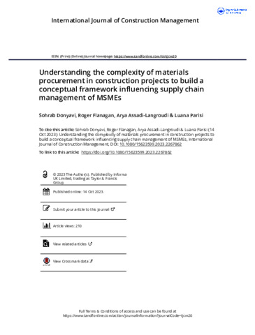 Donyavi, S., Flanagan, R., Assadi-Langroudi, A. and Parisi, L. (2023) Understanding the complexity of materials procurement in construction projects to build a conceptual framework influencing supply chain management of MSMEs. International Journal of Construction Management. ISSN 2331-2327 doi: 10.1080/15623599.2023.2267862