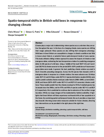 Wyver, C., Potts, S. G. orcid id iconORCID: https://orcid.org/0000-0002-2045-980X, Edwards, M., Edwards, R. and Senapathi, D. orcid id iconORCID: https://orcid.org/0000-0002-8883-1583 (2023) Spatio-temporal shifts in British wild bees in response to changing climate. Ecology and Evolution, 13 (11). e10705. ISSN 2045-7758 doi: 10.1002/ece3.10705