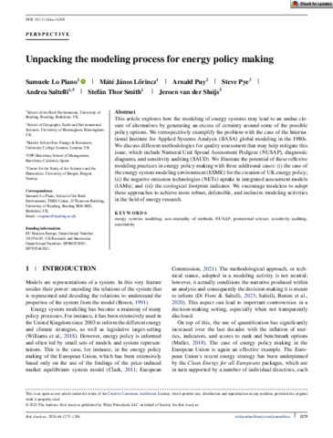 Lo Piano, S. orcid id iconORCID: https://orcid.org/0000-0002-2625-483X, Lőrincz, M. J. orcid id iconORCID: https://orcid.org/0000-0002-3853-0918, Puy, A., Pye, S., Saltelli, A., Smith, S. T. orcid id iconORCID: https://orcid.org/0000-0002-5053-4639 and van der Sluijs, J. (2024) Unpacking the modelling process for energy policy making. Risk Analysis, 44 (6). pp. 1273-1284. ISSN 1539-6924 doi: 10.1111/risa.14248