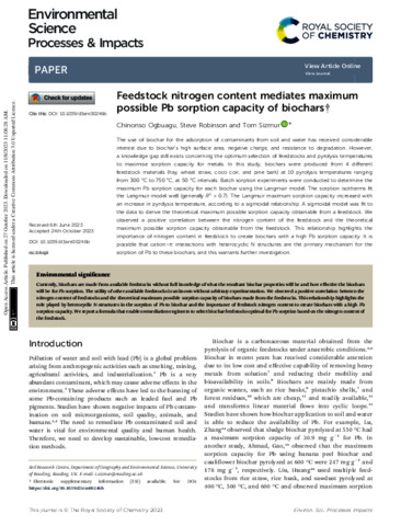Ogbuagu, C., Robinson, S. orcid id iconORCID: https://orcid.org/0000-0003-1045-4412 and Sizmur, T. orcid id iconORCID: https://orcid.org/0000-0001-9835-7195 (2023) Feedstock nitrogen content mediates maximum possible Pb sorption capacity of biochars. Environmental Science: Process and Impacts, 25 (12). pp. 1853-2190. ISSN 2050-7895 doi: 10.1039/D3EM00246B