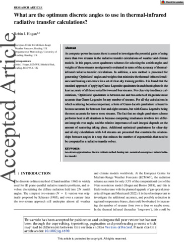 Hogan, R. J. orcid id iconORCID: https://orcid.org/0000-0002-3180-5157 (2023) What are the optimum discrete angles to use in thermal‐infrared radiative transfer calculations? Quarterly Journal of the Royal Meteorological Society. ISSN 1477-870X doi: 10.1002/qj.4598