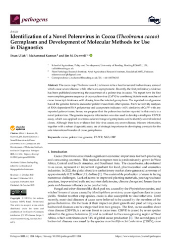 Ullah, I. orcid id iconORCID: https://orcid.org/0000-0002-9367-6741, Kamran, M. and Dunwell, J. M. orcid id iconORCID: https://orcid.org/0000-0003-2147-665X (2023) Identification of a novel polerovirus in cocoa (Theobroma cacao) germplasm and development of molecular methods for use in diagnostics. Pathogens, 12 (11). 1284. ISSN 2076-0817 doi: 10.3390/pathogens12111284
