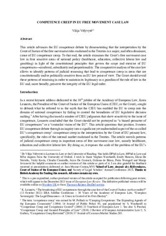 This article advances the EU competence debate by demonstrating that the interpretation by the Court of Justice of the free movement rules enshrined in the Treaties is a major, and often dominant, cause of EU competence creep. To that end, the article examines the Court’s free movement case law in four sensitive areas of national policy (healthcare, education, collective labour law and gambling) in light of the constitutional principles that govern the scope and exercise of EU competences—conferral, subsidiarity and proportionality. The comparative analysis of the case law allows to identify patterns of judicial reasoning that lead to competence creep in areas that are constitutionally and/or politically sensitive from an EU law point of view. The Court should avoid these patterns of reasoning in order to maintain its legitimacy as a guardian of the rule of law in the EU and, more broadly, preserve the integrity of the EU legal order.
