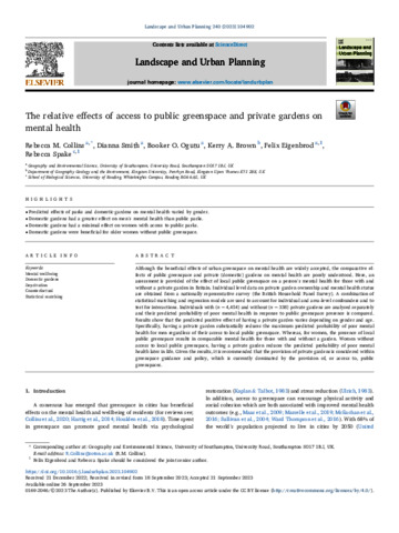 Although the beneficial effects of urban greenspace on mental health are widely accepted, the comparative effects of public greenspace and private (domestic) gardens on mental health are poorly understood. Here, an assessment is provided of the effect of local public greenspace on a person’s mental health for those with and without a private garden in Britain. Individual level data on private garden ownership and mental health status are obtained from a nationally representative survey (the British Household Panel Survey). A combination of statistical matching and regression models are used to account for individual and area-level confounders and to test for interactions. Individuals with (n = 4,454) and without (n = 338) private gardens are analysed separately and their predicted probability of poor mental health in response to public greenspace presence is compared. Results show that the predicted positive effect of having a private garden varies depending on gender and age. Specifically, having a private garden substantially reduces the maximum predicted probability of poor mental health for men regardless of their access to local public greenspace. Whereas, for women, the presence of local public greenspace results in comparable mental health for those with and without a garden. Women without access to local public greenspace, having a private garden reduces the predicted probability of poor mental health later in life. Given the results, it is recommended that the provision of private gardens is considered within greenspace guidance and policy, which is currently dominated by the provision of, or access to, public greenspaces.