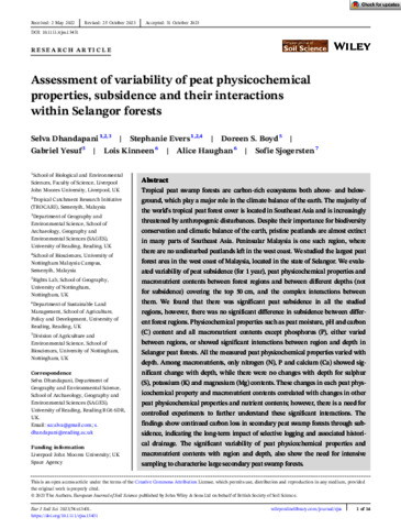 Dhandapani, S. orcid id iconORCID: https://orcid.org/0000-0001-8522-5177, Evers, S., Boyd, D. S., Yesuf, G. orcid id iconORCID: https://orcid.org/0000-0003-0963-2998, Kinneen, L. orcid id iconORCID: https://orcid.org/0000-0001-5502-8113, Haughan, A. and Sjogersten, S. (2023) Assessment of variability of peat physicochemical properties, subsidence and their interactions within Selangor forests. European Journal of Soil Science, 74 (6). e13431. ISSN 1365-2389 doi: 10.1111/ejss.13431