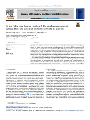 Cantarella, S. orcid id iconORCID: https://orcid.org/0000-0002-1243-5533, Hillenbrand, C. orcid id iconORCID: https://orcid.org/0000-0002-2929-5098 and Brooks, C. orcid id iconORCID: https://orcid.org/0000-0002-2668-1153 (2023) Do you follow your head or your heart? The simultaneous impact of framing effects and incidental emotions on investment decisions. Journal of Behavioral and Experimental Economics, 107. 102124. ISSN 2214-8043 doi: 10.1016/j.socec.2023.102124