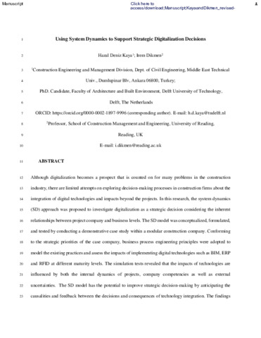 Although digitalization becomes a prospect that is counted on for many problems in the construction industry, there are limited attempts on exploring decision-making processes in construction firms about the integration of digital technologies and impacts beyond the projects. In this research, the system dynamics (SD) approach was proposed to investigate digitalization as a strategic decision considering the inherent relationships between project company and business levels. The SD model was conceptualized, formulated, and tested by conducting a demonstrative case study within a modular construction company. Conforming to the strategic priorities of the case company, business process engineering principles were adopted to model the existing practices and assess the impacts of implementing digital technologies such as BIM, ERP and RFID at different maturity levels. The simulation tests revealed that the impacts of technologies are influenced by both the internal dynamics of projects, company competencies as well as external uncertainties. The SD model has the potential to improve strategic decision-making by anticipating the causalities and feedback between the decisions and consequences of technology integration. The findings and model development steps proposed in this paper can be used by other companies that aim to make process improvements with digital technologies as well as researchers exploring the implications of digitalization in construction considering competencies and uncertainties.