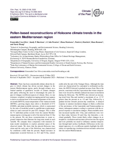 There has been considerable debate about the degree to which climate has driven societal changes in the eastern Mediterranean region, partly through reliance on a limited number of qualitative records of climate changes and partly reflecting the need to disentangle the joint impact of changes in different aspects of climate. Here, we use tolerance-weighted, weighted-averaging partial least squares to derive reconstructions of the mean temperature of the coldest month (MTCO), mean temperature of the warmest month (MTWA), growing degree days above a threshold of 0 ◦C (GDD0), and plant-available moisture, which is represented by the ratio of modelled actual to equilibrium evapotranspiration (α) and corrected for past CO2 changes. This is done for 71 individual pollen records from the eastern Mediterranean region covering part or all of the interval from 12.3 ka to the present. We use these reconstructions to create regional composites that illustrate the long-term trends in each variable. We compare these composites with transient climate model simulations to explore potential causes of the observed trends. We show that the glacial–Holocene transition and the early part of the Holocene was characterised by conditions colder than the present. Rapid increases in temperature occurred between ca. 10.3 and 9.3 ka, considerably after the end of the Younger Dryas. Although the time series are characterised by centennial to millennial oscillations, the MTCO showed a gradual increase from 9 ka to the present, consistent with the expectation that winter temperatures were forced by orbitally induced increases in insolation during the Holocene. The MTWA also showed an increasing trend from 9 ka and reached a maximum of ca. 1.5 ◦C greater than the present at ca. 4.5 and 5 ka, followed by a gradual decline towards present-day conditions. A delayed response to summer insolation changes is likely a reflection of the persistence of the Laurentide and Fennoscandian ice sheets; subsequent summer cooling is consistent with the expected response to insolation changes. Plant-available moisture increased rapidly after 11 ka, and conditions were wetter than today between 10 and 6 ka, but thereafter, α declined gradually. These trends likely reflect changes in atmospheric circulation and moisture advection into the region and were probably too small to influence summer temperature through land–surface feedbacks. Differences in the simulated trajectory of α in different models highlight the difficulties in reproducing circulation-driven moisture advection into the eastern Mediterranean.