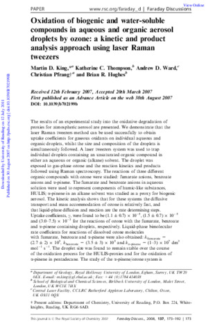 King, M.D., Pfrang, C., Hughes, B.R., Thompson, K.C. and Ward, A.D. (2008) Oxidation of biogenic and water-soluble compounds in aqueous and organic aerosol droplets by ozone: a kinetic and product analysis approach using laser Raman tweezers. Faraday Discussions, 137. pp. 173-192. ISSN 1359-6640 doi: 10.1039/b702199b