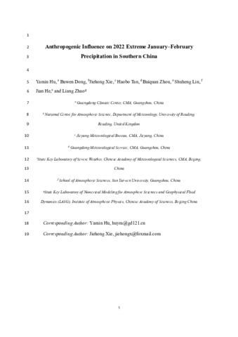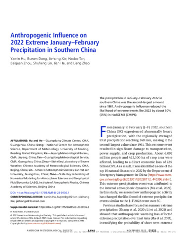 Hu, Y., Dong, B. orcid id iconORCID: https://orcid.org/0000-0003-0809-7911, Xie, J., Tan, H., Zhou, B., Lin, S., He, J. and Zhao, L. (2023) Anthropogenic influence on 2022 extreme January–February precipitation in Southern China. Bulletin of the American Meteorological Society, 104 (11). E1935-E1940. ISSN 1520-0477 doi: 10.1175/BAMS-D-23-0136.1