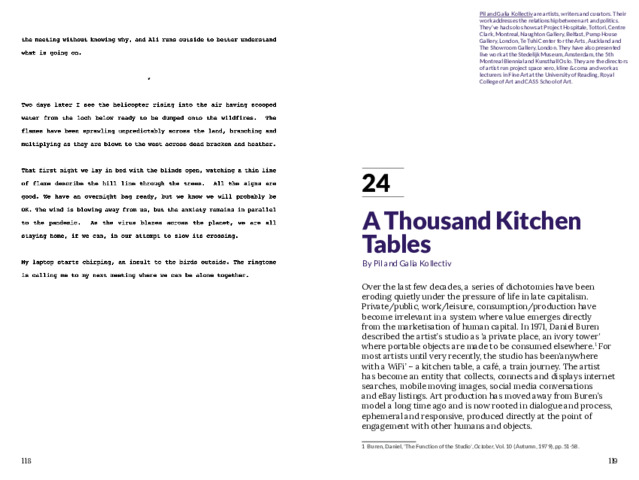 Kollectiv, P. orcid id iconORCID: https://orcid.org/0000-0001-8349-9318 and Kollectiv, G. (2021) A thousand kitchen tables. In: Bajec, M., Holert, T. and Smith, M. (eds.) Pause. Fervour. Reflections on a Pandemic. Harun Farocki Institut & Journal of Visual Culture, pp. 119-122. ISBN 9781527295445