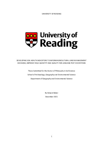 Baker, E. (2022) Developing soil health indicators to inform agricultural land management decisons, improve yield quantity and quality for lowland peat ecosystems. PhD thesis, University of Reading. doi: 10.48683/1926.00114039